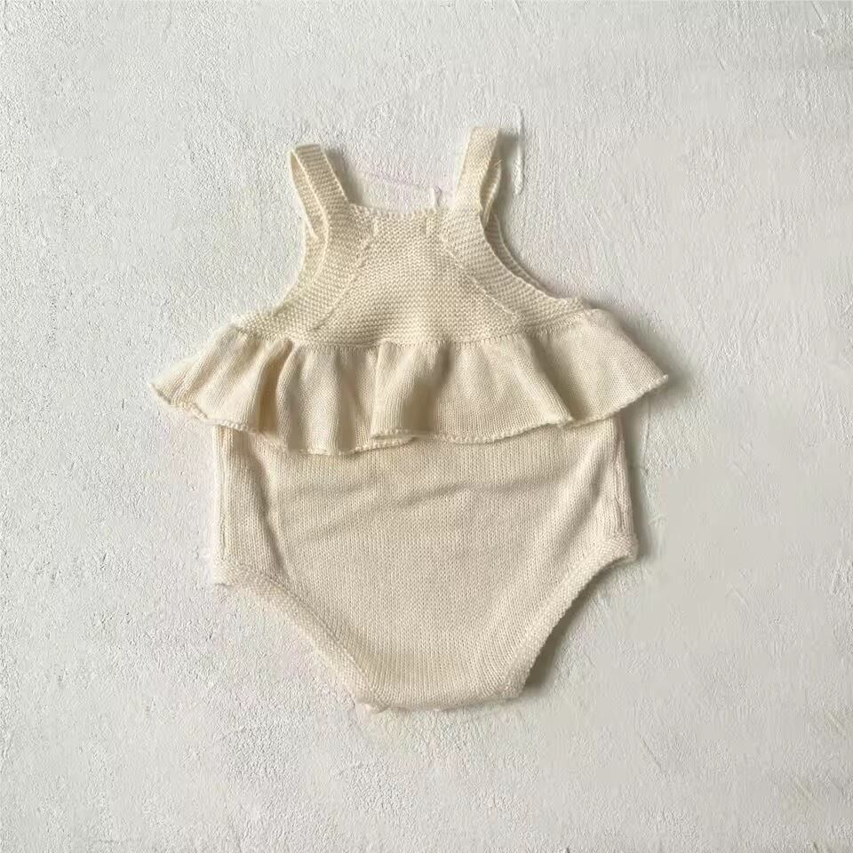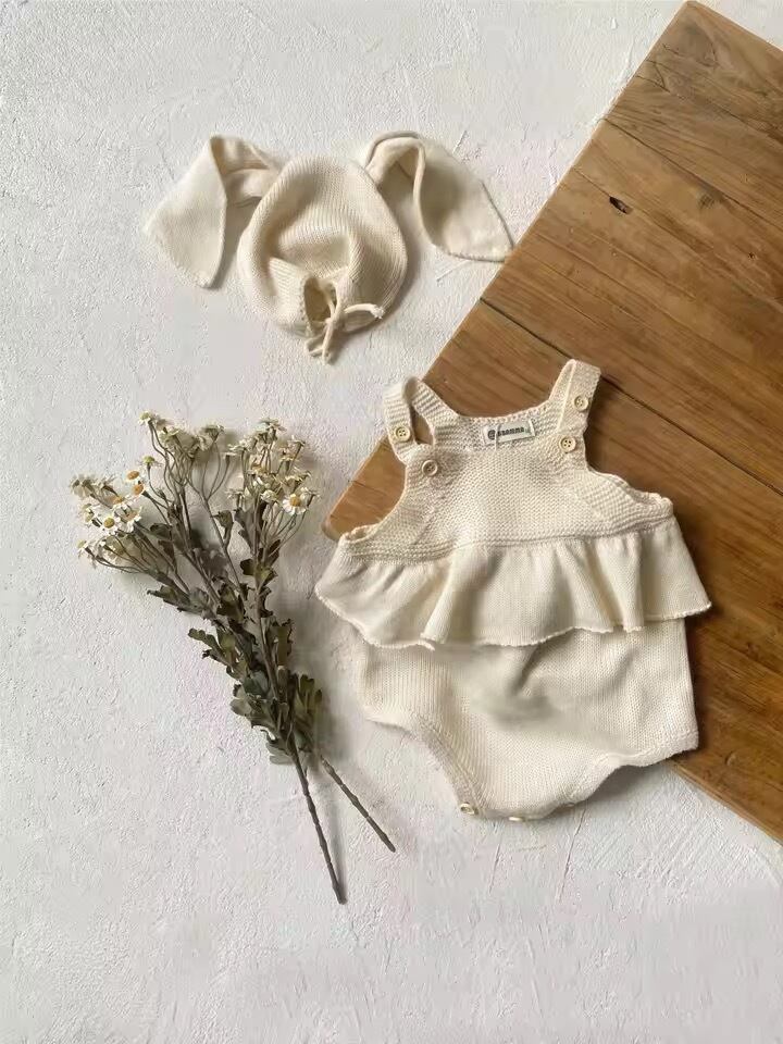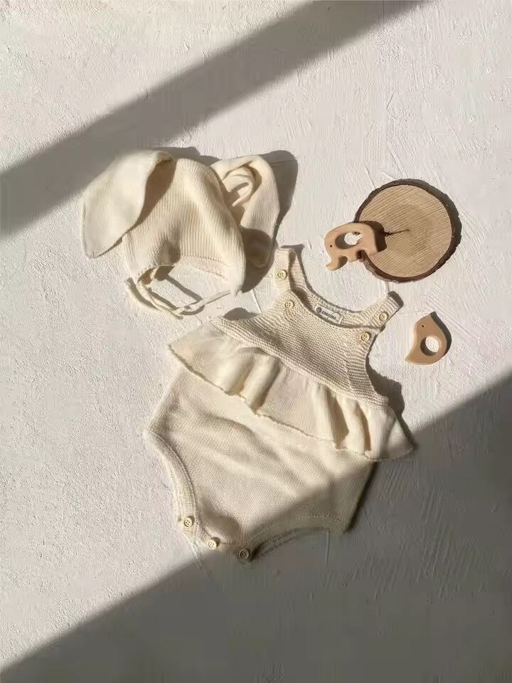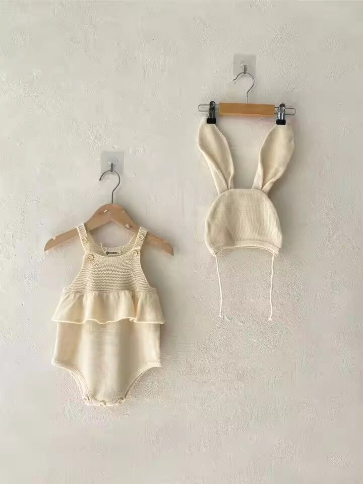 うさ耳帽子付きニット編みロンパース
