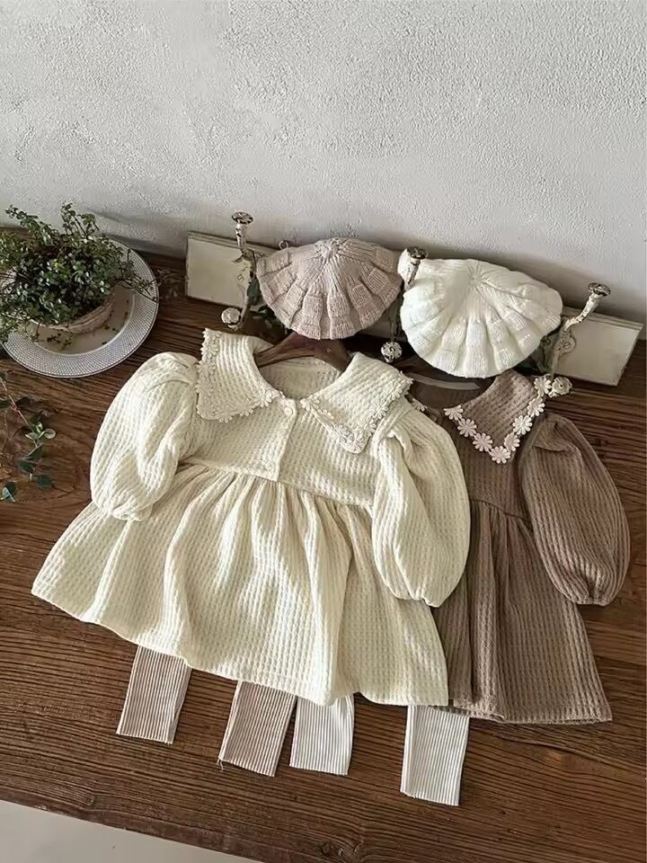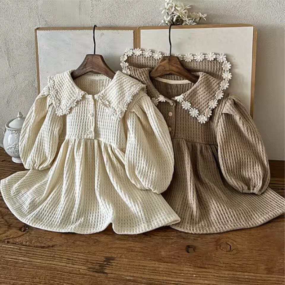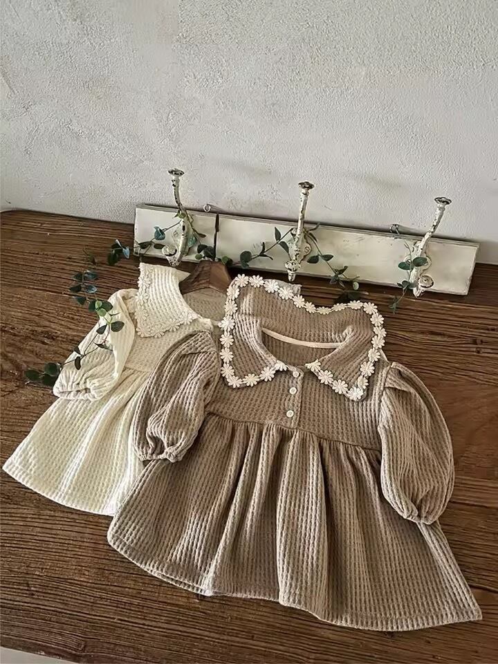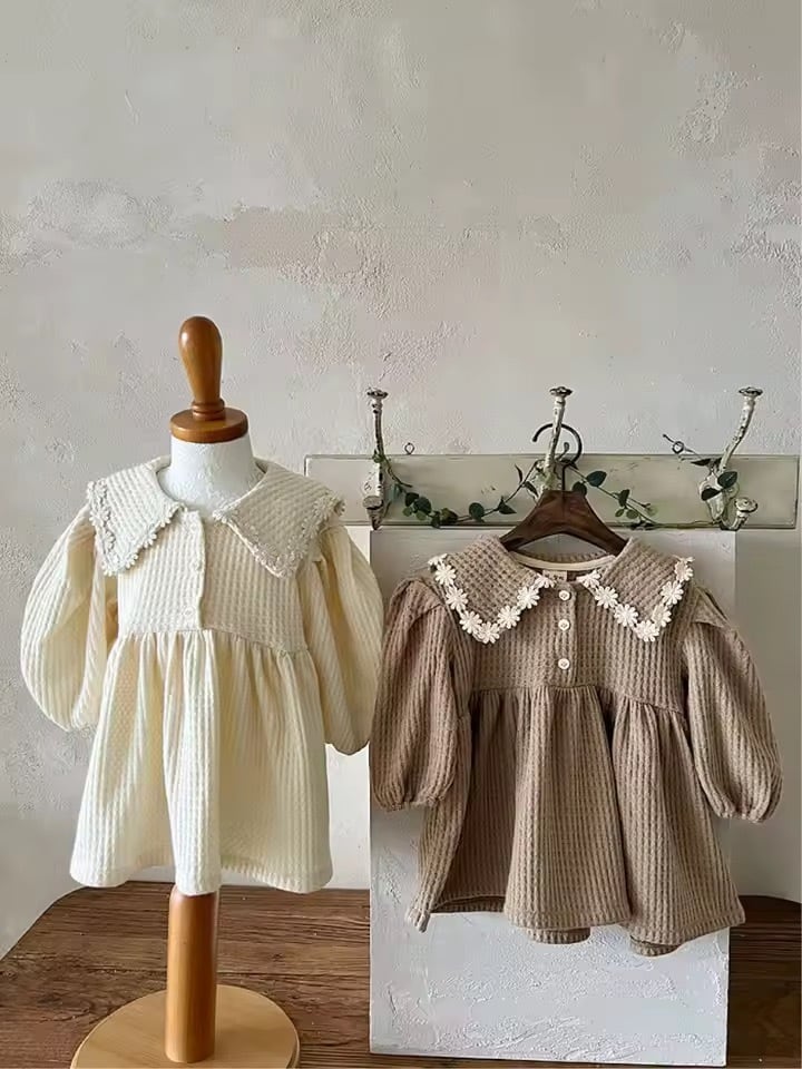 お花レースカラーワッフル長袖ワンピース